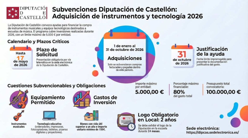 La concreción de los aspectos generales regulados en la Ordenanza general de subvenciones de la Diputación de Castellón y sus Organismos Autónomos para la concesión de subvenciones, en régimen de concurrencia competitiva, por la Excma. Diputación Provincial de Castelló a las entidades descritas en la base tercera, con la finalidad de contribuir a la financiación de los gastos de adquisición de instrumentos musicales y otros bienes inventariables necesarios para el desarrollo de la actividad, que se realicen del 1 de enero al 31 de octubre de 2026, en ejecución de lo dispuesto en la vigente Ordenanza General de Subvenciones de la Excma. Diputación Provincial de Castellón.