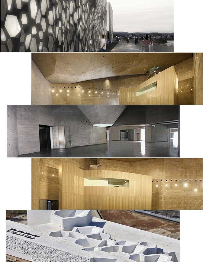 El diseño del edificio es obra de los arquitectos Enrique Sobejano y Fuensanta Nieto —una propuesta que aúna concepción industrial, geometría y versatilidad. Su estructura se basa en un patrón hexagonal que articula salas de distintos tamaños (150, 90, 60 m²), combinables entre sí, permitiendo transformar los espacios en función de las necesidades expositivas o creativas.