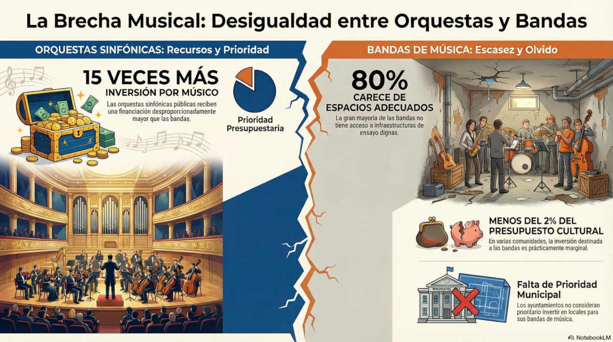 • Las orquestas sinfónicas públicas reciben hasta 15 veces más financiación por músico que las bandas de música.