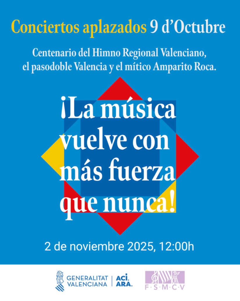 Se trata de los conciertos organizados junto con la Federación de Sociedades Musicales de la Comunitat Valenciana (FSMCV), previstos para el 9 d’Octubre y que fueron aplazados por la alerta meteorológica